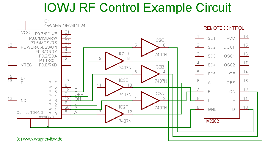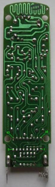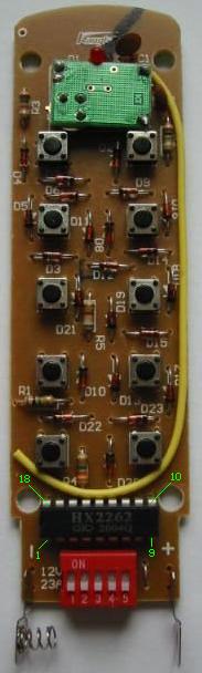 Im Handsender kommt ein Schaltkreis vom Typ HX2262, vermutlich ein Einchip-Mikroprozessor, zum Einsatz. Wer sich mit asiatischen Schriftzeichen gut auskennt, kann gerne das Datenblatt studieren ;-). Weil wir gerade bei Datenblättern sind: Das zum verwendeten Schaltkreis 74LS07 findet man hier. Den Datenblättern kann man auch entnehmen, wie die Pins bei Schaltkreisen gezählt werden (das ist jedoch typunabhängig).